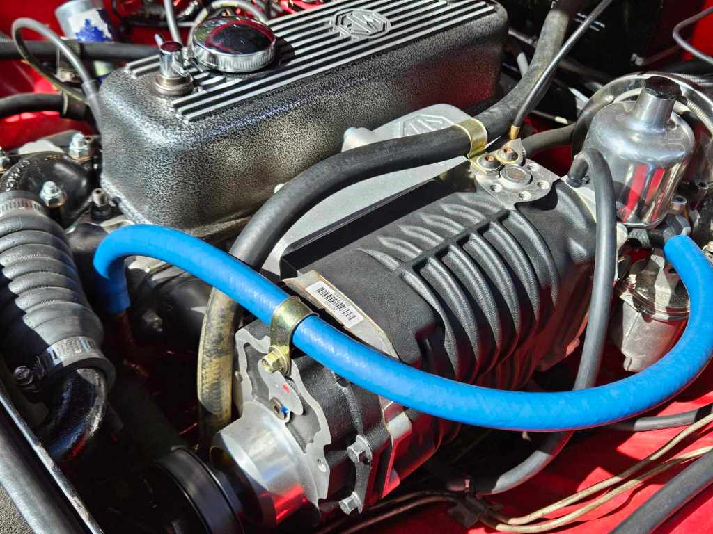 This car is something rather special for an MGB. It’s been the subject of some significant upgrades, including a supercharger, power steering and leather upholstery.