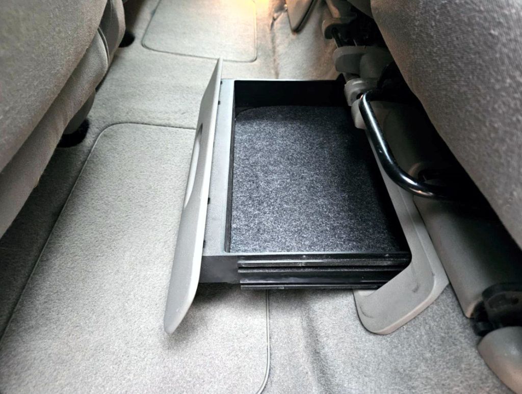 There are multiple storage boxes in the floors, drawers under the seats, a sliding centre console with two big storage boxes and each rear seat folds separately, comes out and can slide back and forth.
